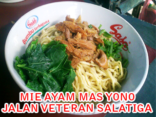 Jika anda adalah salah satu penggemar kuliner berbahan mie, rasanya kurang lengkap kalau belum menikmati salah satu alternatif kuliner di kota salatiga ini. Adalah Pak Yono, atau biasa dipanggil "Mas Yono", pemilik warung mie ayam di Jalan Veteran Salatiga (depan penjagaan 411). Dengan cita rasa yang khas yang bertahan selama -/+ 2 dasawarsa. Untuk menikmati satu porsi mie ayam ini hanya dipatok harga 4500 rupiah. Murah bukan? Jika anda sedang melintas, jangan sungkan untuk mampir. Ayamnya memiliki potongan yang lumayan besar, meski pembelinya ramai dan ngantri ngantri, tapi sang penjual tetap konsen terhadap kebersihan gerobaknya Akses untuk menikmati sajian mie ayam ini cukup mudah, terletak di jalur utama solo semarang, tepatnya di jalan veteran, jika anda dari pasar sapi, maka berjalanlah ke arah solo sekitar 200 meter maka anda akan menemukan warung di kanan jalan bercat putih dengan banner mie ayam Mas Yono. Buka setiap hari mulai jam 4 sore sampai jam 9 malam. POKOKE MAK NYoS Silahkan Mencoba