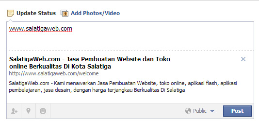 Apabila metadata sudah lengkap maka facebook akan menampilkan data lengkap website anda seperti gambar diatas. ( status facebook dengan link www.salatigaweb.com )
