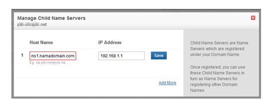 - Pada bagian Manage Child Name Servers => Host Name & IP Address anda isi sesuai NS yang anda inginkan beserta IP Server yang sudah di berikan Detail Akun yang dikirim ke email anda sebelumnya, jelasnya, Lihat Gambar 1.1
